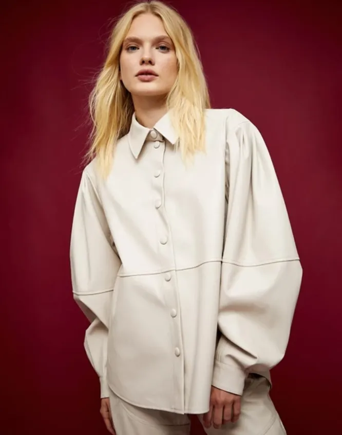 По-прежнему актуальны и кожаные рубашки. В этом сезоне советуем обратить внимание на модель кремового оттенка с объемными рукавами.