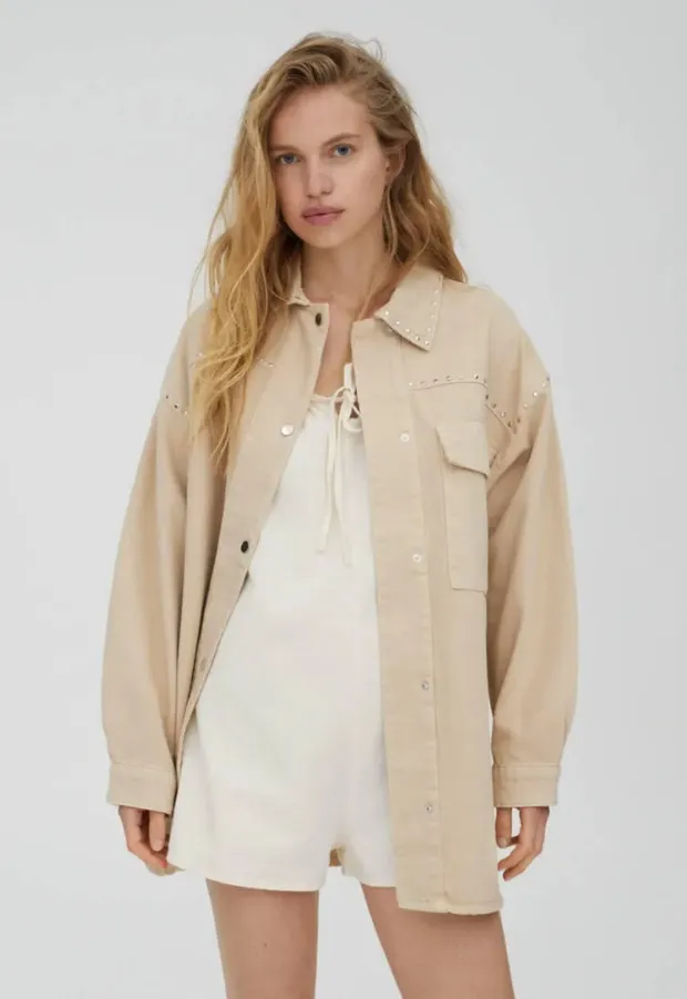 В весеннюю базовую капсулу также отлично впишется свободная бежевая рубашка с лаконичным декором.