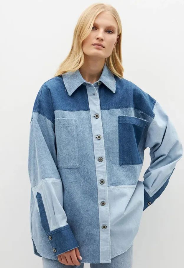 Если хочешь что-то поинтереснее, то обрати внимание на джинсовую рубашку оверсайз в стиле пэчворк.