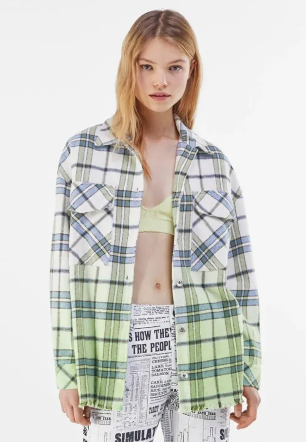 Вечно актуальная модель — рубашка в клетку. На весну предлагаем вариант с вкраплениями неоновых оттенков.