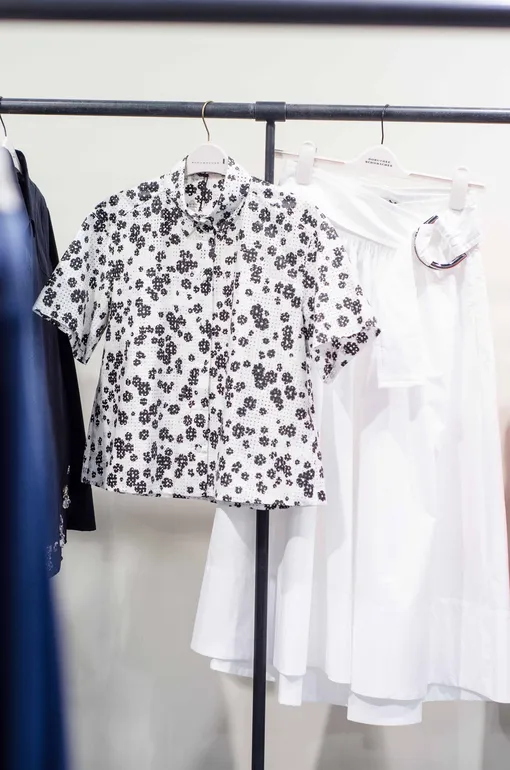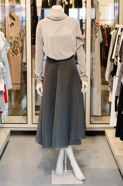 В Vnukovo Outlet Village нам удалось обнаружить настоящие сокровища: юбку из многослойной сетки двух цветов (бежевый и серый) и совершенно удивительный топ цвета хаки «инкрустированный» крупными камнями, как если бы это было ожерелье (Dorothee Schumacher).