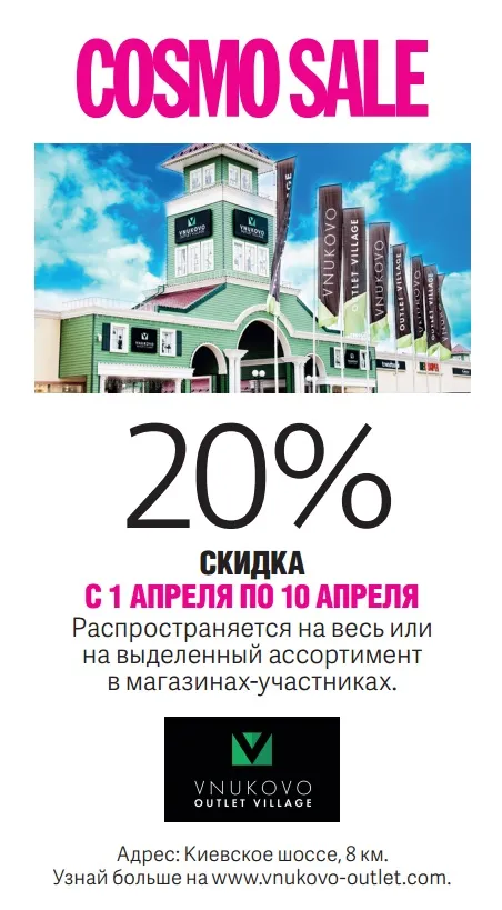 Ты ведь уже знаешь, что Vnukovo Outlet Village – уникальное место, где «живут» твои любимые бренды, но с обязательным дисконтом вообще на все 50% круглый год? Рассказываем: только с 1 по 10 апреля ты можешь получить дополнительную скидку 20% от цены аутлета (купон на скидку и подробности ищи внизу статьи)! Стилист VOICE Фиона Гикрамина сходила на разведку, о чем незамедлительно докладывает тебе!