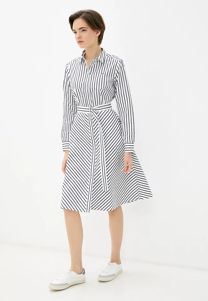Платье-рубашка с контрастными асимметричными полосками отвлечет внимание от недостатков фигуры. Тонкий пояс акцентирует внимание на талии и визуально удлинит силуэт. Добавь пару обуви на каблуке, чтобы прибавить сантиметров к росту и выглядеть еще стройнее. Такое платье идеально подойдет на полную фигуру с животом.