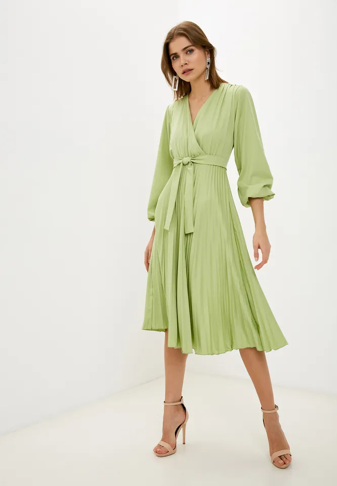 На фото — идеальный фасон платья, скрывающего недостатки фигуры. Моедли с запахом волшебным образом делают тебя стройнее. Аккуратный акцент на талию, V-образный вырез, свободные рукава — по эффекту эта формула сопоставима с месяцем диеты и тренировок. Не стоит выбирать слишком короткие модели: отдай предпочтение длине миди или даже макси. Лучше всего «работают» однотонные ткани или ткани с мелким рисунком.