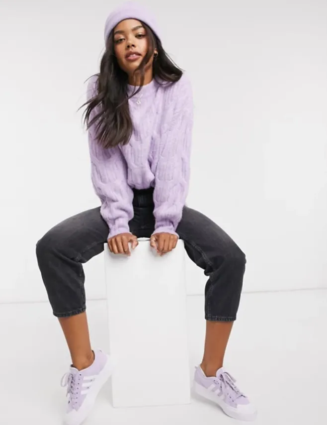Пушистый лавандовый кардиган — то что нужно весной, когда хочется добавить в гардероб красок и освежить привычные сочетания вещей.