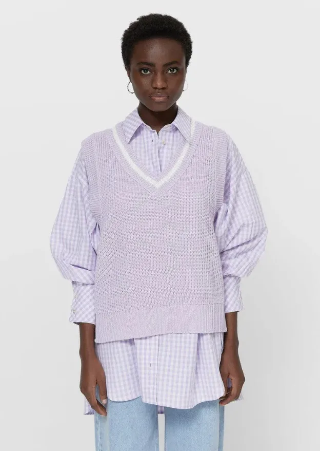 Трикотажные жилеты по-прежнему актуальны. Освежить весенние образы поможет модель нежно-сиреневого цвета. Сочетай ее с рубашками пастельных оттенков и светлыми джинсами.