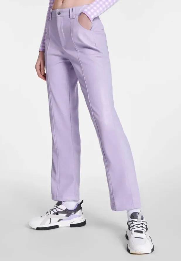 Если хочешь быть в тренде, добавь к кардигану сиреневые кожаные брюки. Получишь модный монохромный лук, в котором органично сочетаются контрастные фактуры (трикотаж и кожа).