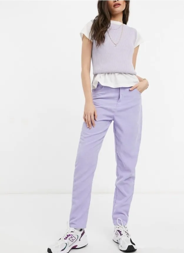 Если надоели обычные джинсы классического цвета (синие, голубые, черные), обрати внимание на вельветовую пару лавандового оттенка. Дополняй белыми кроссовками, светлым джемпером и джинсовой оверсайз-курткой.