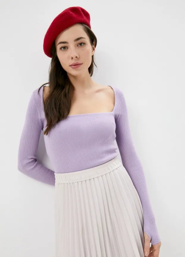 Лавандовый топ в рубчик — удачная альтернатива скучным базовым водолазкам и футболкам. Он отлично сочетается и с женственными юбками миди, и с широкими брюками, и с джинсами.