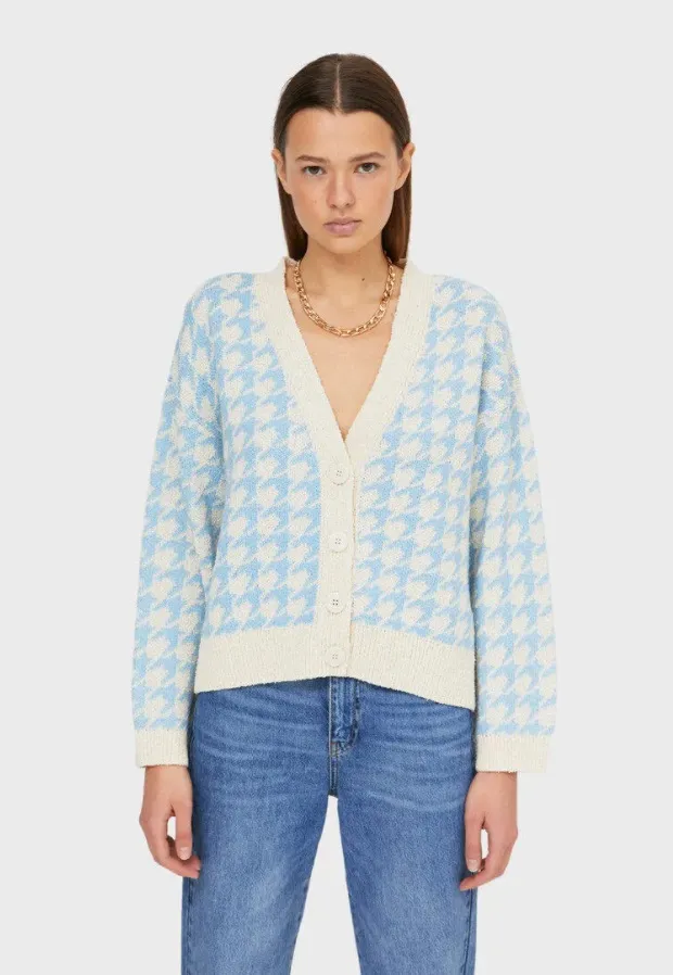 Если ты в поисках актуального кардигана, то обрати внимание на модель с принтом «гусиная лапка». Модные активистки носят похожие на голое тело с джинсами-трубами и ботильонами на каблуке.