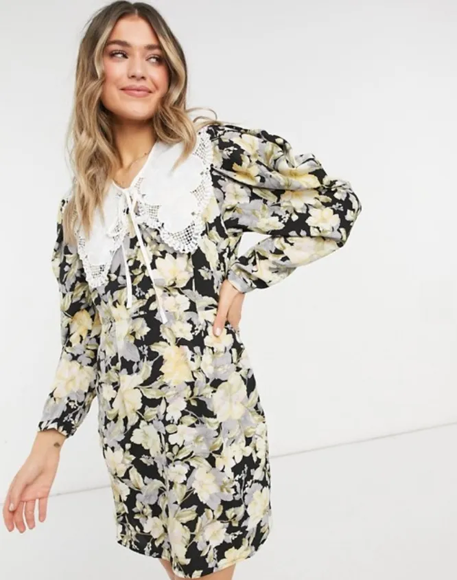 Для весенних романтичных луков отлично подойдет платье с цветочным принтом и большим белым воротничком. Играй на контрастах и носи его с грубыми ботинками и кожаной оверсайз-курткой или поддержи романтичное настроение с помощью остроносых ботильонов и легкого тренча.