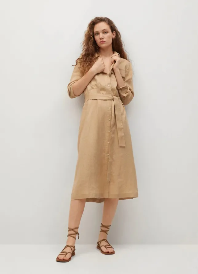 Бежевое платье-рубашка из 100% льна — универсальный предмет гардероба, который всегда выручит. Можно носить его с остроносыми открытыми туфлями, кедами или босоножками.