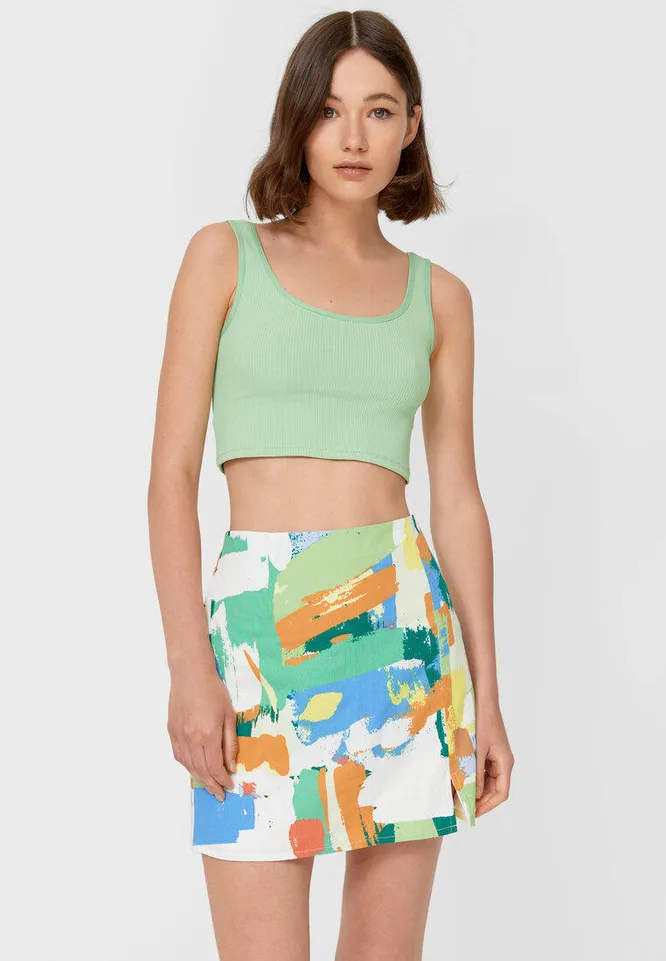 Пестрая юбка с красочным принтом будет органично смотреться в любом аутфите, если подобрать верх в одном из цветов, имеющихся на ней самой.