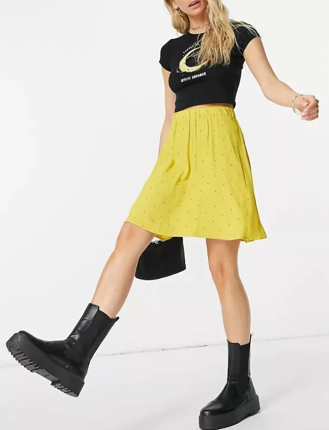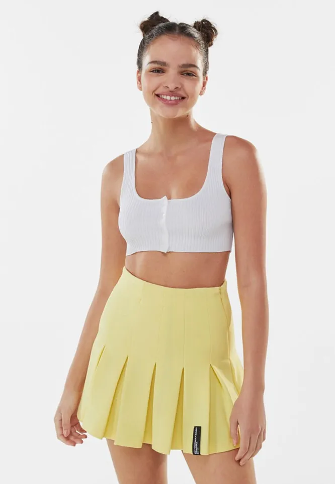 Уже не первый летний сезон актуальны теннисные юбки. Мы подобрали для тебя модель желтого цвета. Сочетай ее с поло и текстильными кедами или кроп-топами и сандалиями.