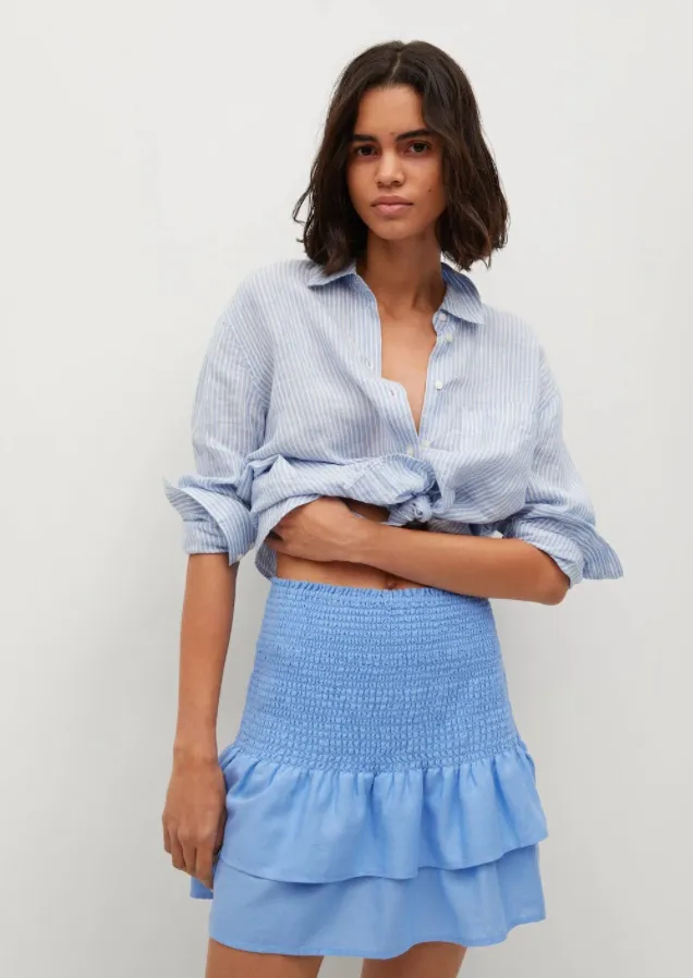 Голубая юбка необычного кроя из 100% льна — лучший выбор на лето. Можно носить ее с легкой рубашкой или укороченным вязаным топом.