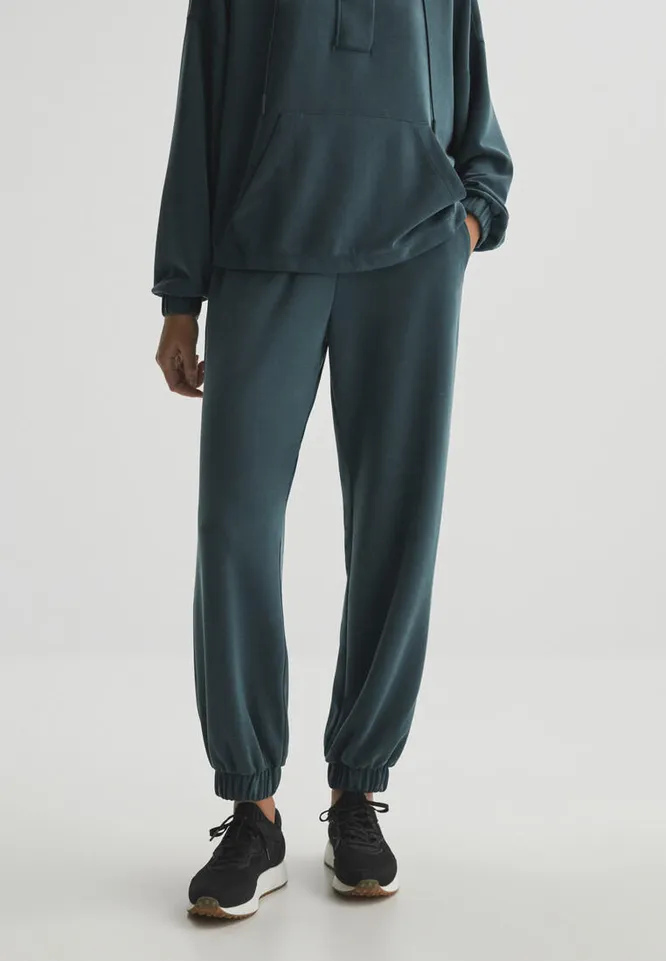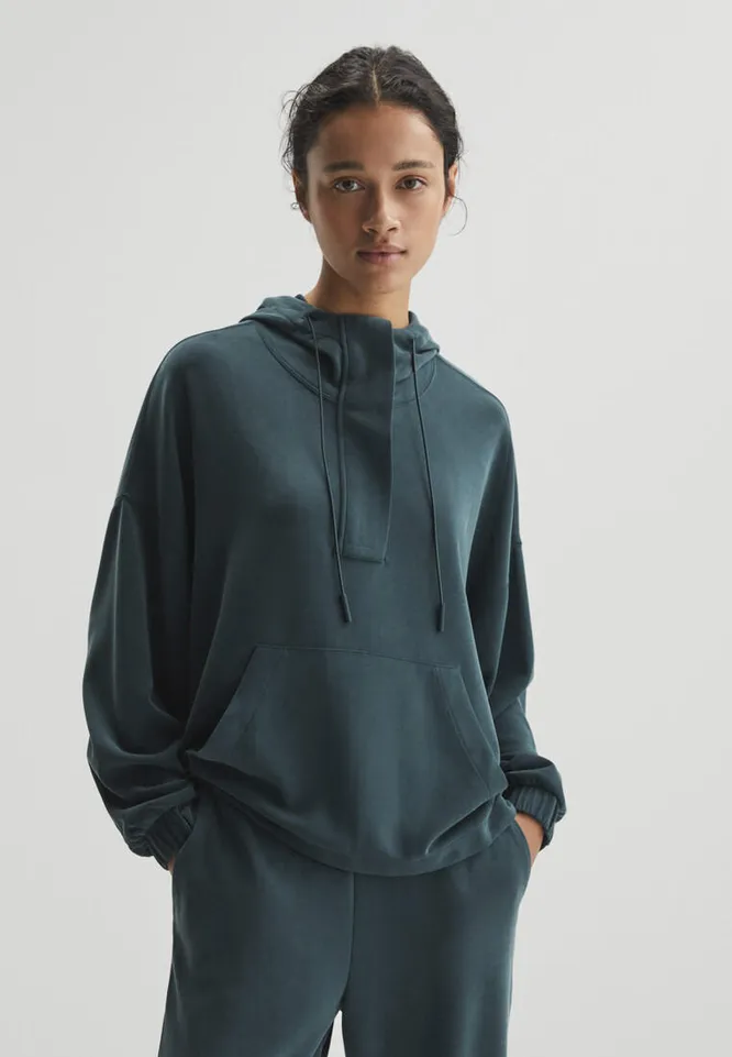 Для дома выбирай этот модный трикотажный женский костюм с брюками и худи темно-зеленого цвета. В таком аутфите будет не стыдно открыть дверь курьеру или принять рабочий звонок. Кроме того, если нужно выйти в магазин или погулять с собакой, можно просто накинуть пуховик. Также в этом модном брючном трикотажном костюме можно занимать спортом дома или в зале.