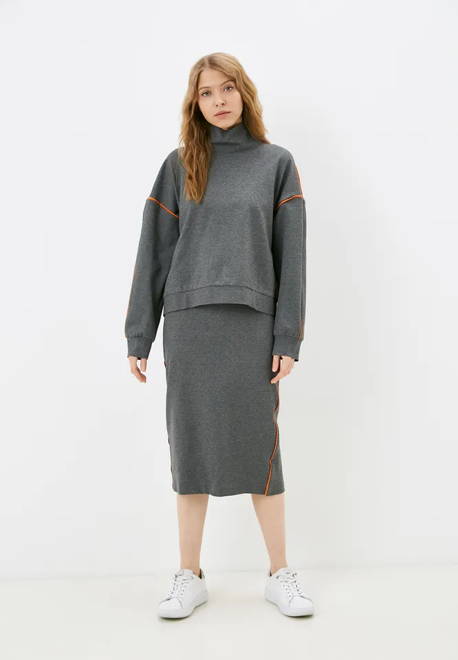 Этот модный трикотажный женский костюм с юбкой подойдет поклонницам спортивного и уличного стилей. Ненавязчивые оранжевые вставки делают серый костюм более ярким и интересным. В комплекте свитшот с высоким горлом и спущенными плечами и прямая юбка миди. Комплект будет круто смотреться с пуховиком оверсайз и ботинками челси на тракторной подошве.