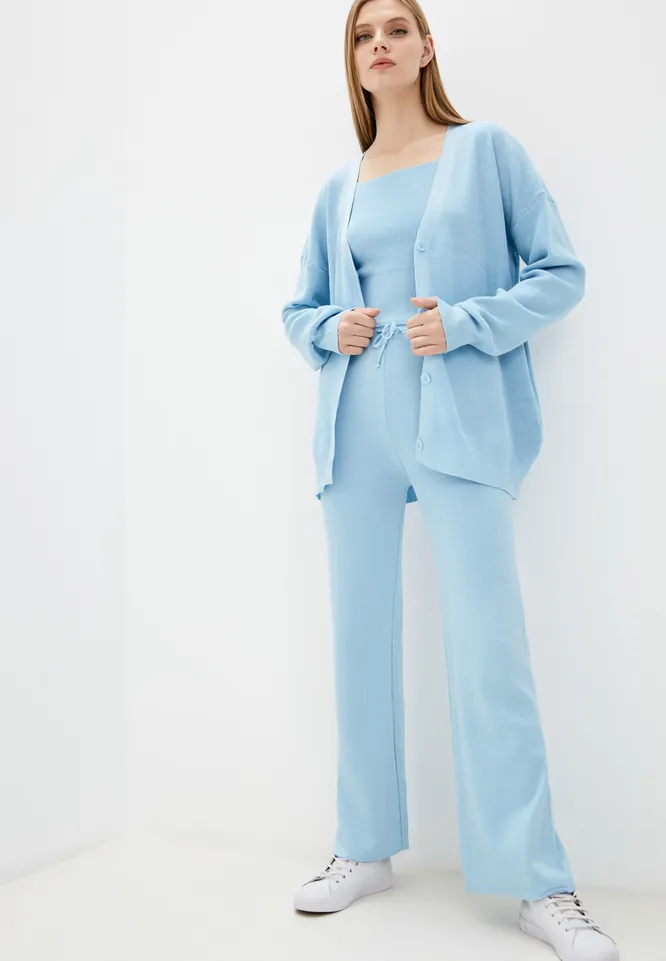Хит среди модных женских трикотажных костюмов 2022 – костюм-тройка. Наш первый фаворит – небесно-голубой комплект с топом на тонких бретелях, кардиганом и широкими брюками. Можно носить как дома, так и на улице. Во втором случае дополняй аутфит белыми ботинками и уютной шубой-чебурашкой. Этот женский трикотажный брючный костюм станет модным дополнением к любому зимнему гардеробу!