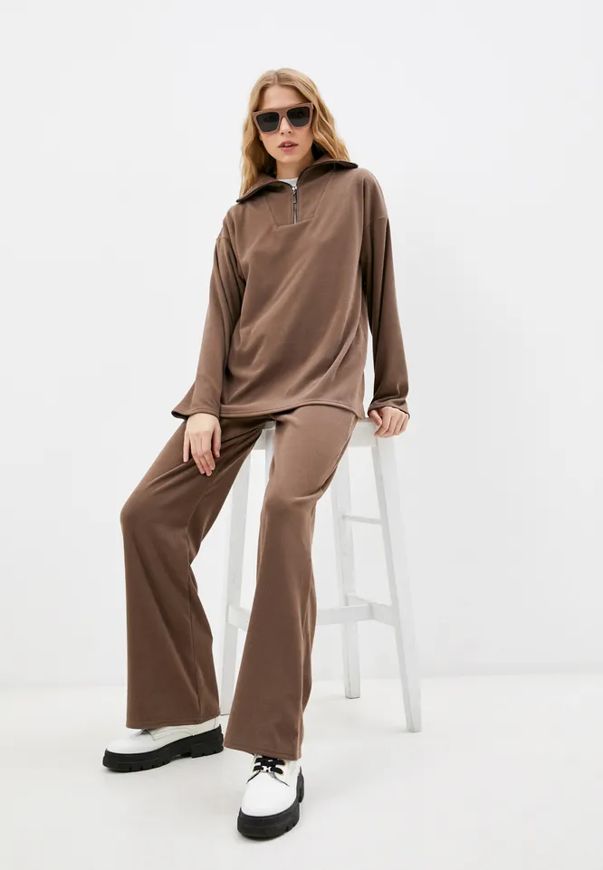 Универсальный вариант на каждый день – модный трикотажный костюм с брюками. В комплекте трендовый джемпер на молнии и стильные брюки клеш. Нейтральный коричневый цвет позволяет миксовать этот комплект с любой верхней одеждой и аксессуарами. Например, ты можешь надеть его и с пальто расслабленного кроя, и с дубленкой-авиатором, и с пуховиком.