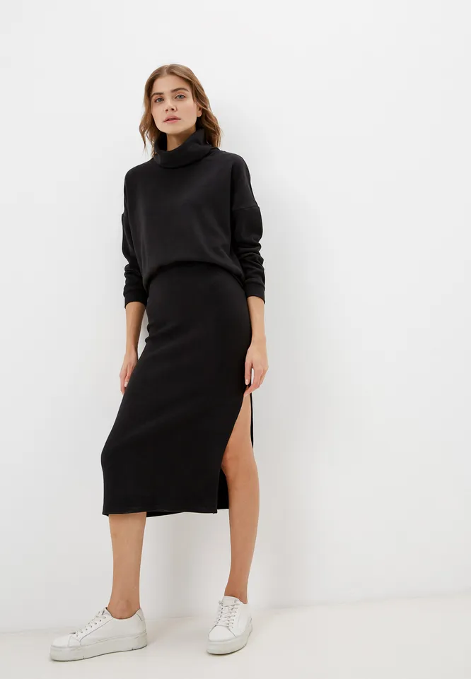 Модный трикотажный костюм с юбкой станет отличным выбором для будничных образов. В нем удобно пойти на шопинг, недолгую прогулку или неформальную встречу в кафе. Мы подобрали для тебя универсальный черный комплект с джемпером под горло и юбкой полуприлегающего кроя с небольшим боковым разрезом. Стильно смотрится с замшевыми ботфортами и элегантными пальто.