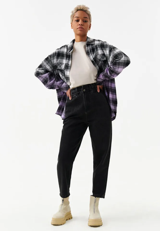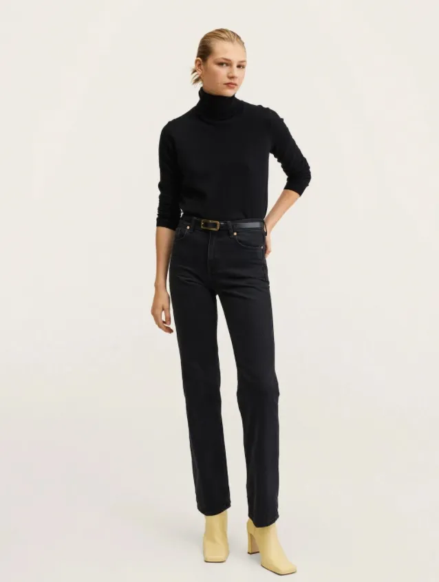 Модные черные джинсы 2022 — «трубы». Идеальный фасон для тех, кто хочет выгодно скорректировать фигуру. Во-первых, за счет прямого широкого кроя и высокой посадки они делают ноги бесконечными, во-вторых, отлично маскируют лишние сантиметры в области бедер и живота. Еще один плюс этой модели – джинсы легко миксуются абсолютно с любыми вещами, обувью и аксессуарами.