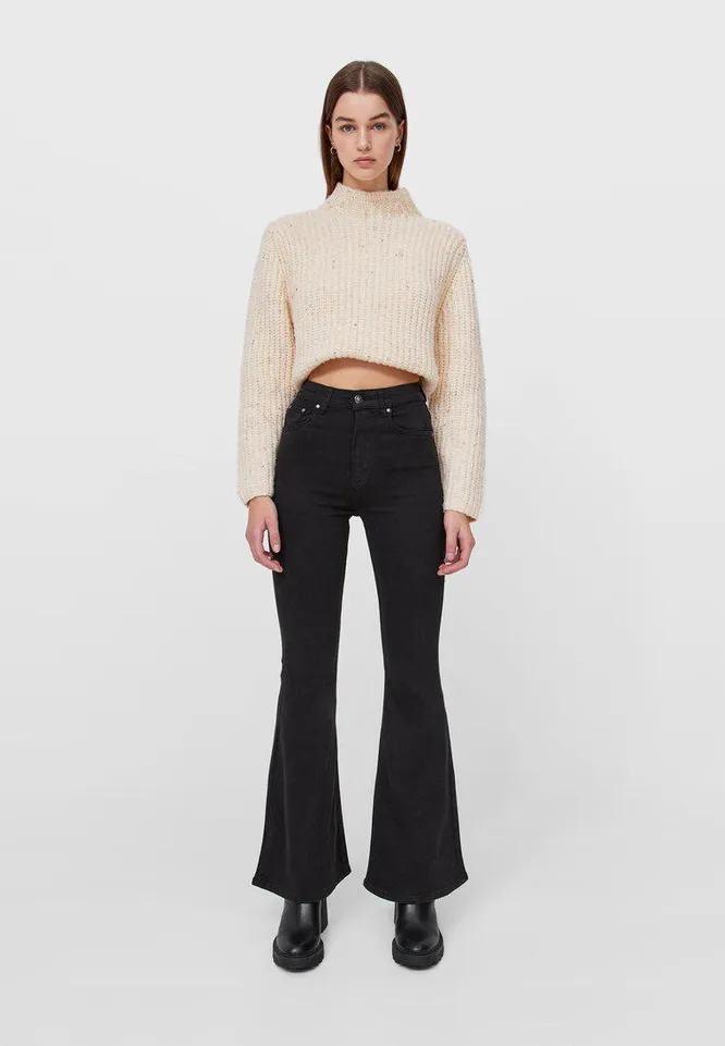 Создать стильный выразительный образ помогут модные черные джинсы клеш с высокой посадкой. На вечеринку надевай их с атласной блузкой рубашечного кроя и ботильонам и на платформе – получится крутой лук в стиле 70-х. В офисе джинсы клеш уместно смотрятся с базовой водолазкой и классическим блейзером. А вне работы сочетай черные расклешенные джинсы со свитером или кардиганом с объемными рукавами.