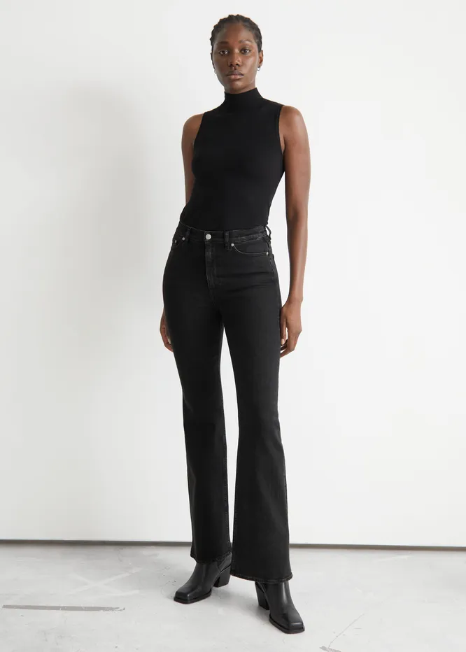 Более богемный вариант – модные черные джинсы с клешем от колена. Это отличный выбор для модных повседневных и праздничных нарядов. В первом случае предлагаем носить их с грубыми ботинками челси и свитером фактурной вязки, во втором – с воздушной блузой из органзы и остроносыми ботильонами на каблуке. И не забудь подчеркнуть талию кожаным ремнем.