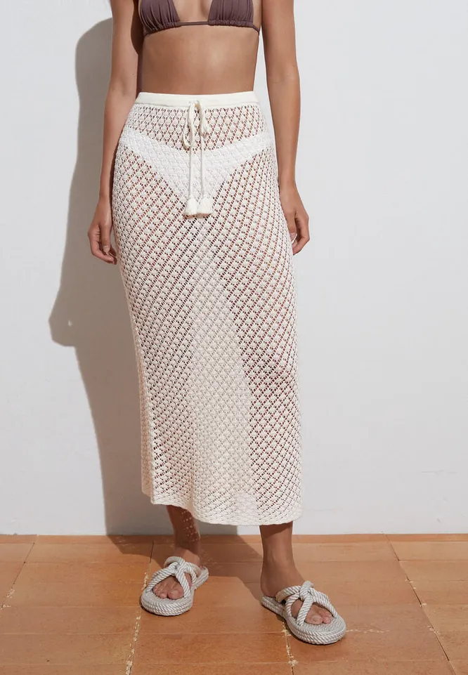 Для пляжных образов подойдет вязаное платье и юбка-сетка. Надевай их поверх купальника – это добавит аутфиту сексуальность.
