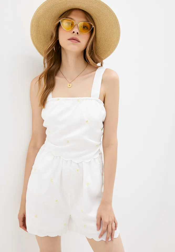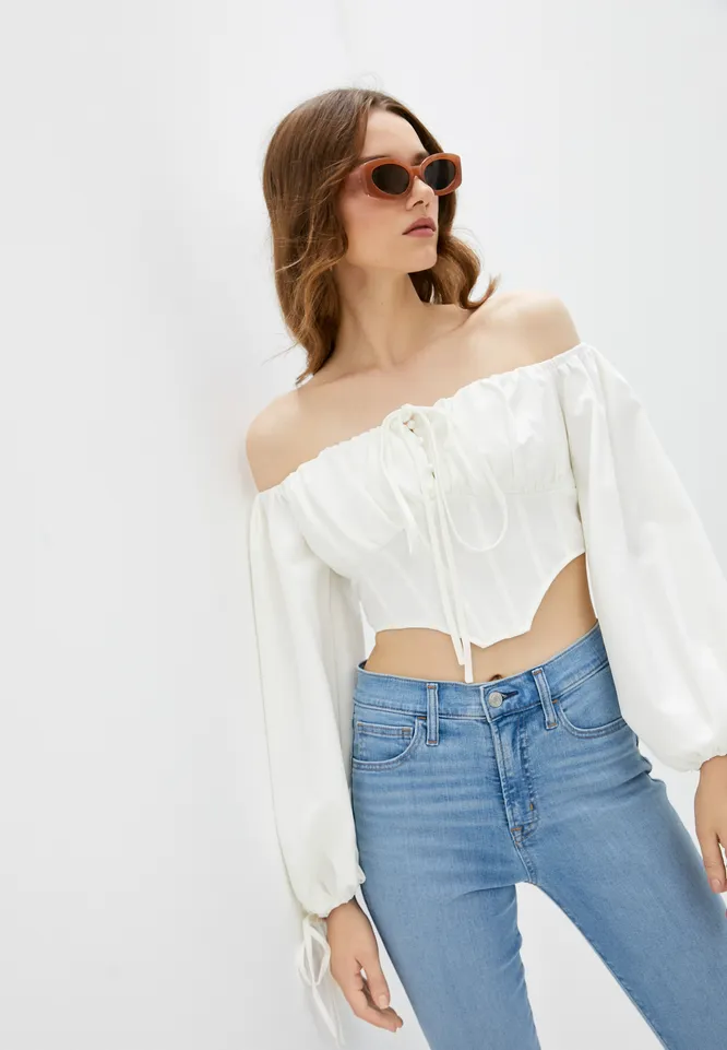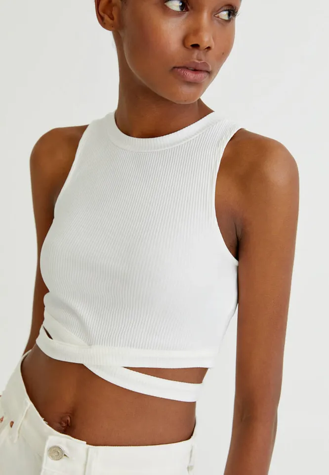 Что касается топов, то этим летом дизайнеры предлагают носить модели в романтичном стиле с оборками, бантиками, рукавами-фонариками. В качестве базы выбирай кроп-топы в рубчик. В этом сезоне на пике популярности топы с завязками на талии.