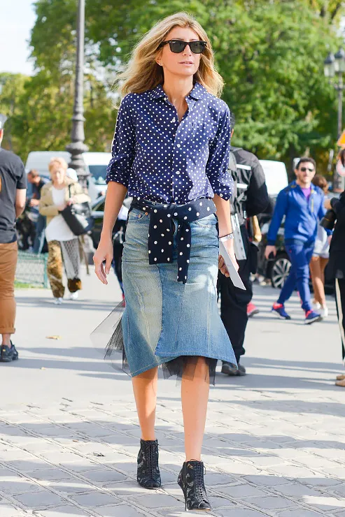 Беспроигрышный вариант с гороховой блузой — джинсы или однотонная юбка/брюки. То же правило работает и в обратную сторону. Юбка с принтом, к примеру, запросто «подружится» с белым топом или рубашкой в мужском стиле.