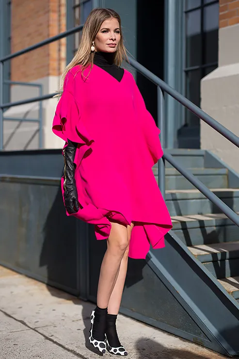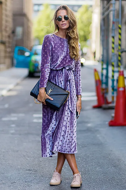 На календаре — весна, но погода пока совсем «не шепчет», а потому попробуй соединить в одном образе легкое платье в горох, водолазку и грубые ботинки.