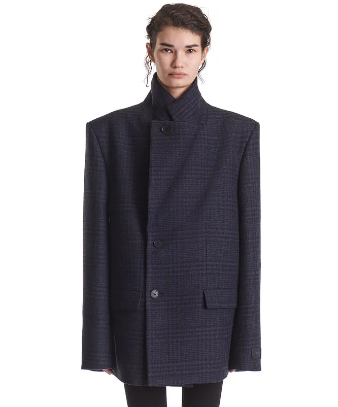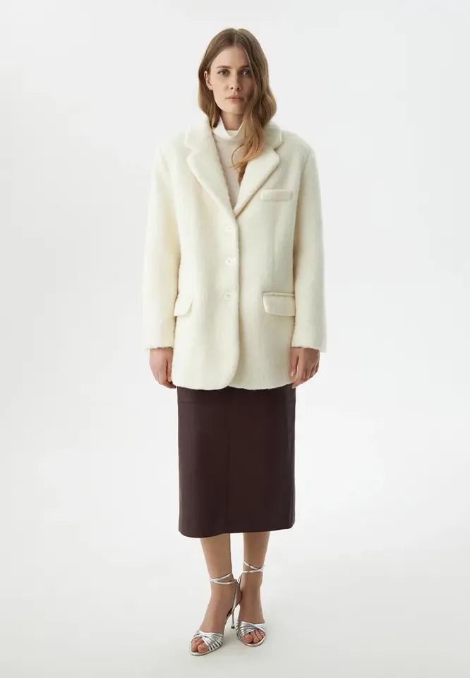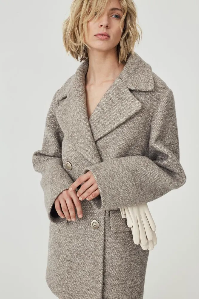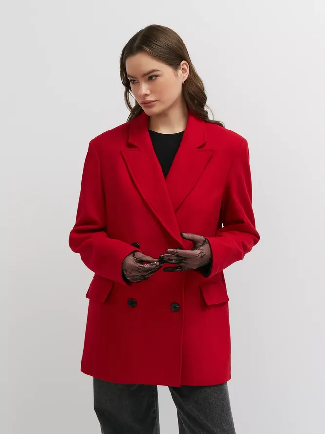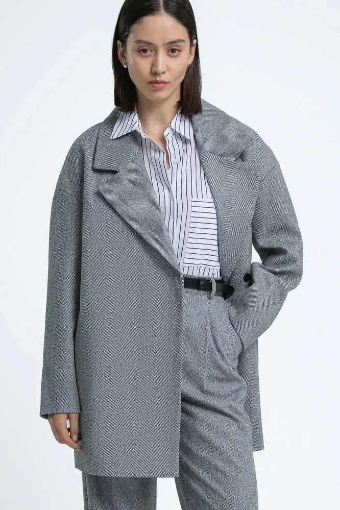 Классический вариант — пальто-пиджак, доходящий до бедер, и выполненный из плотных теплых материалов, например, шерсти. Чем качественнее состав, тем лучше изделие будет держать форму, и это крайне важно — иначе геометричность просто потеряется.