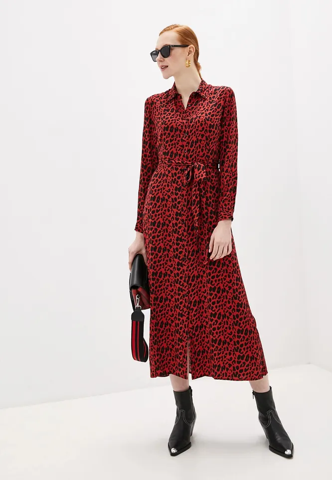 Яркое платье из легких тканей можно носить и в холод, сочетая с чем-то теплым, к примеру, поддев вниз тонкую водолазку из шерсти. Лучше всего подойдут модели лаконичных оттенков, которые не будут конфликтовать с рисунком на платье. Сюда же отлично впишется дутый пуховик до середины бедра, который мы советуем дополнить поясом. Завершат образ крупные серьги и обувь в тон водолазке.