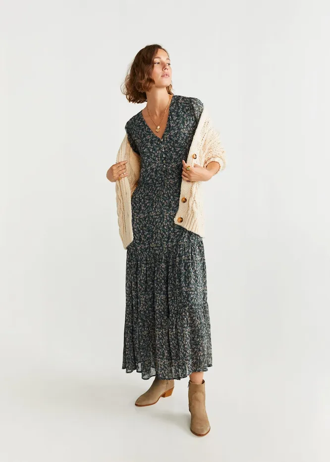 Отличный вариант на зиму — образ в стиле бохо-шик. Запоминай рецепт: берем цветочное платье-миди, дополняем его свободным кардиганом на крупных пуговицах и сапогами в стиле вестерн. Чтобы подчеркнуть талию и сделать силуэт более женственным, используй пояс. Лучше всего, если он будет в тон казакам — таким образом наряд получится цельным, логичным и завершенным.