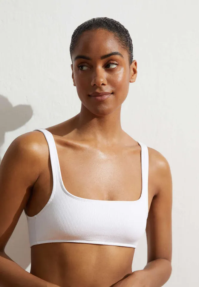 Лаконичные купальники в рубчик по-прежнему актуальны. Наш выбор — простой бикини-топ и высокие плавки.