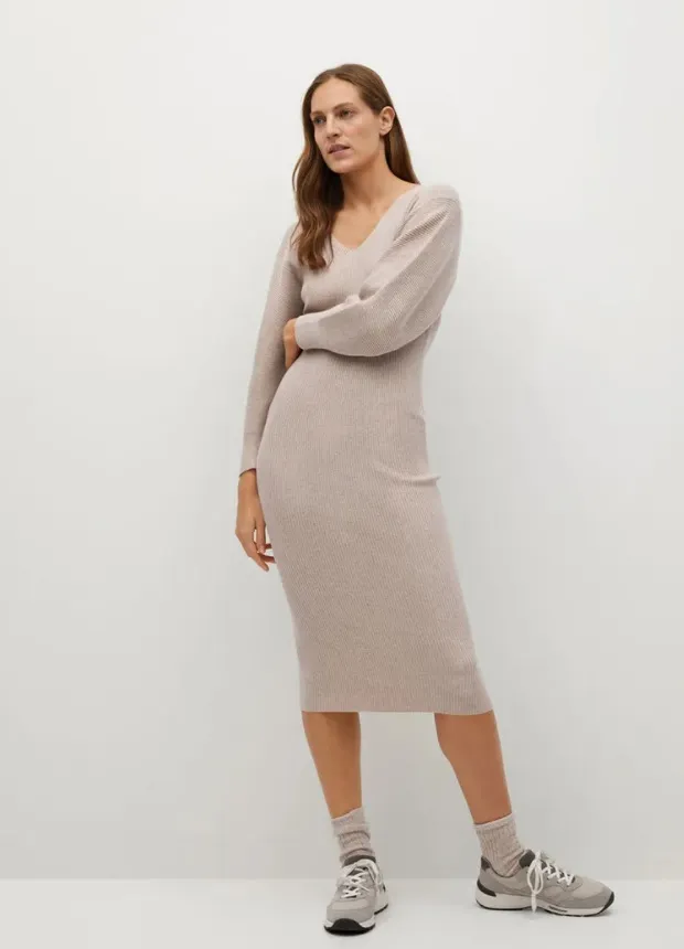 Трикотажное платье по фигуре — незаменимая вещь в зимне-весеннем гардеробе. Модель из плотной рубчатой ткани с V-образным вырезом визуально удлинит шею и скроет недостатки фигуры. Платье отлично сочетается как с кедами и кроссовками, так и с классическими туфлями и высокими сапогами на каблуке.