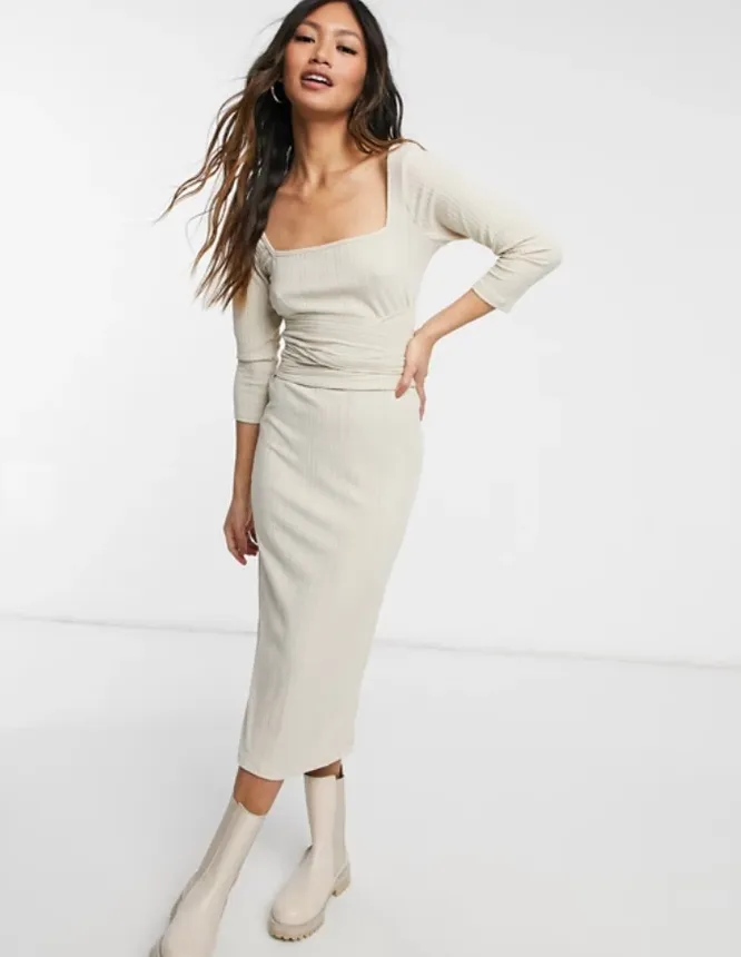 Платье с модным в этом сезоне квадратным вырезом подчеркнет изящные ключицы и визуально удлинит шею. Предлагаем носить его с аккуратными ожерельями и изысканными подвесками.