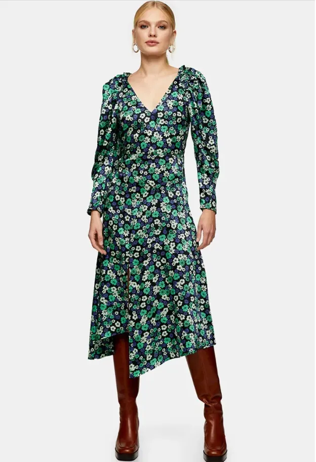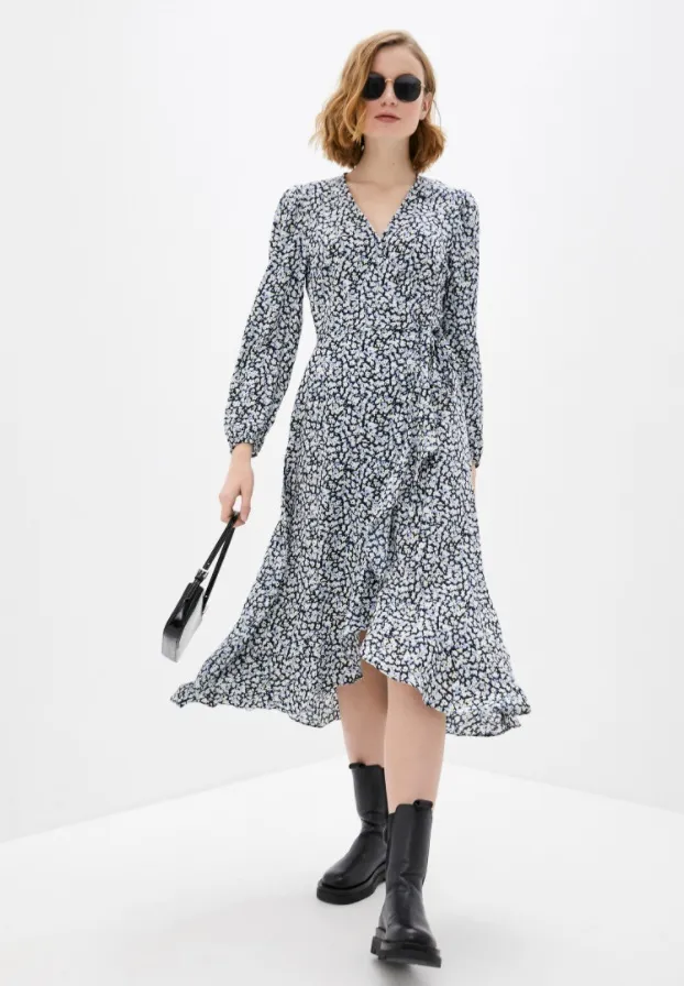 Чтобы сделать фигуру более женственной и выразительной, выбирай платье миди с запахом. Наш фаворит — модель с мелким цветочным принтом и оборками.