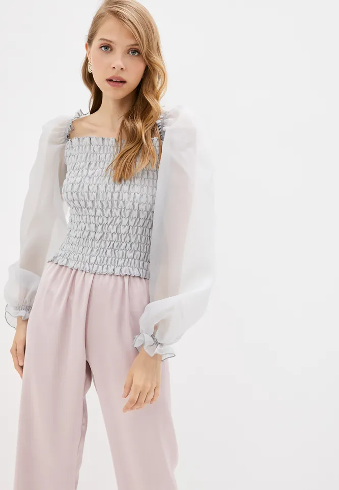 Эта модель подойдет для вечерних образов. Лучше всего она будет смотреться с мини-юбкой по фигуре, брюками палаццо, плиссированной юбкой миди.