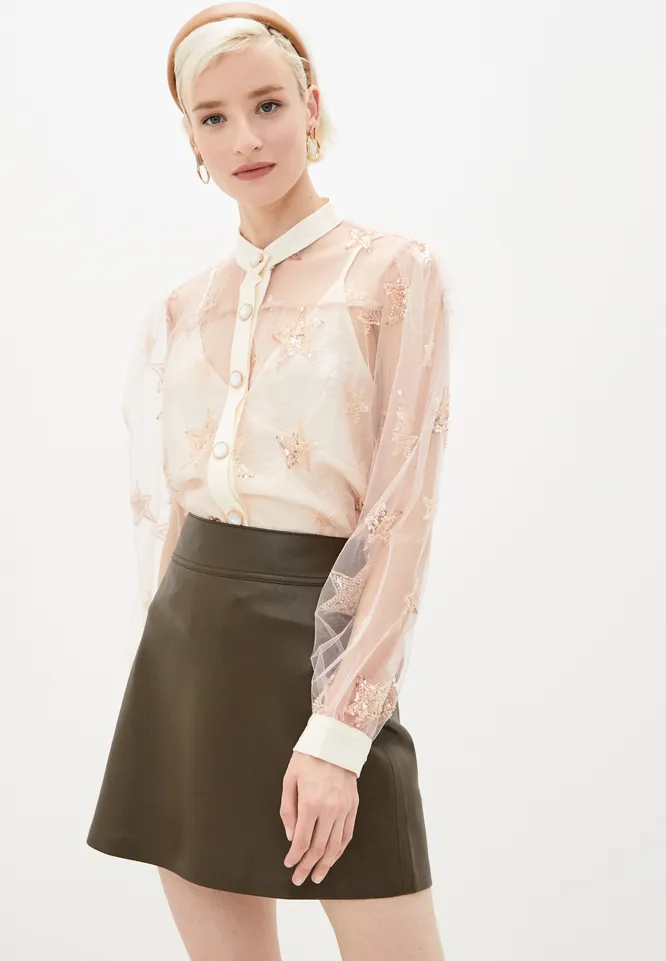 Вечерний вариант. Предлагаем носить такую блузку с лаконичной юбкой А-силуэта и туфлями «мэри джейн».
