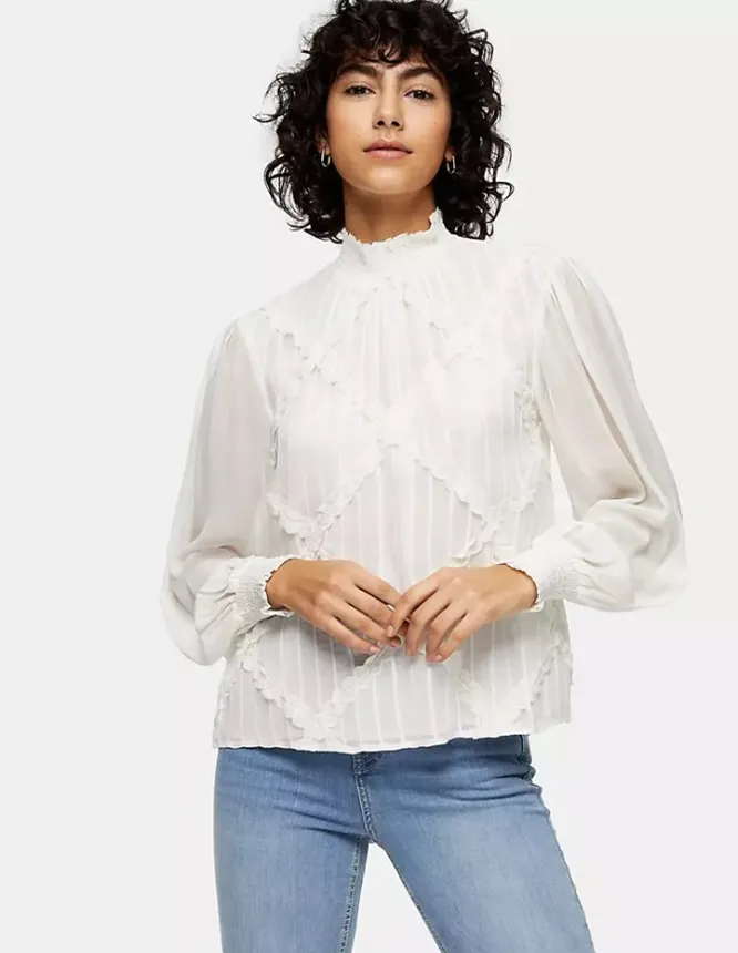 Разнообразить офисный гардероб поможет фактурная белая блуза с воротником-стойкой. Дополняй ее строгими брюками со стрелками и лодочками.