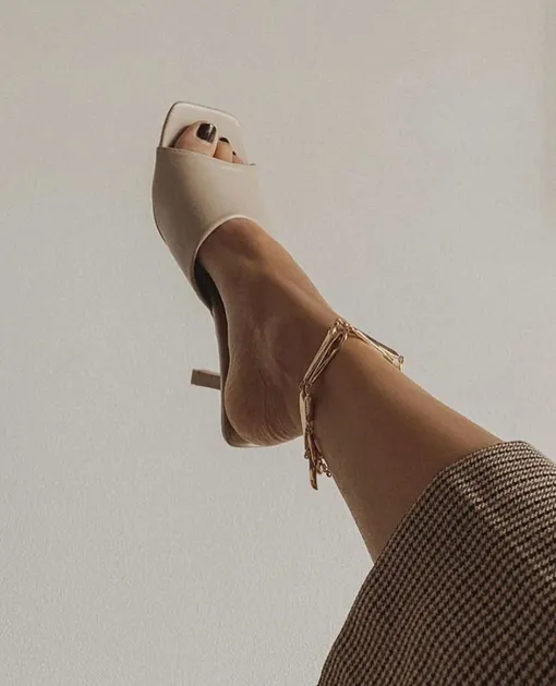 Модные босоножки имеют глубокий вырез, открывающий пальцы, и квадратную линию носка.