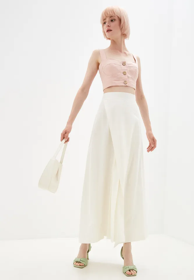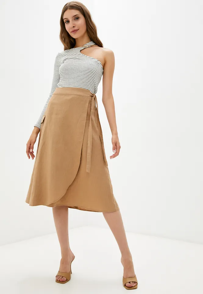 Нейтральная песочная юбка с запахом легко впишется как в повседневные, так и в деловые образы. В первом случае носи ее с кроп-топом, во втором — с шелковой блузкой или прямой рубашкой с коротким рукавом.