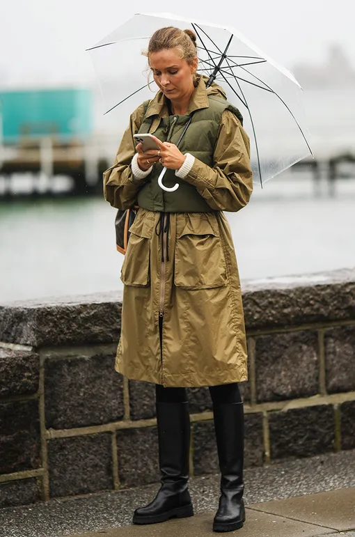 Об эстетике моряка мы написали подробнее, потому что ее называют чуть ли не главной модной фишкой 2025 года. Если говорить кратко, то фокусируемся не только на традиционной бретонской полоске и мокасинах, но и на утилитарных макинтошах, дождевиках и резиновых сапогах – так тренд и приручим.