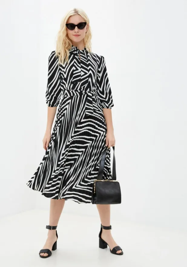Платье с незамысловатым геометрическим принтом можно носить и в офис, и на прогулку, и на вечеринку. Главное — правильно подобрать аксессуары.