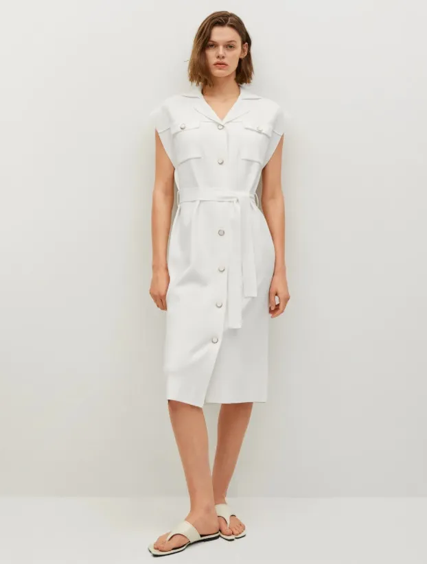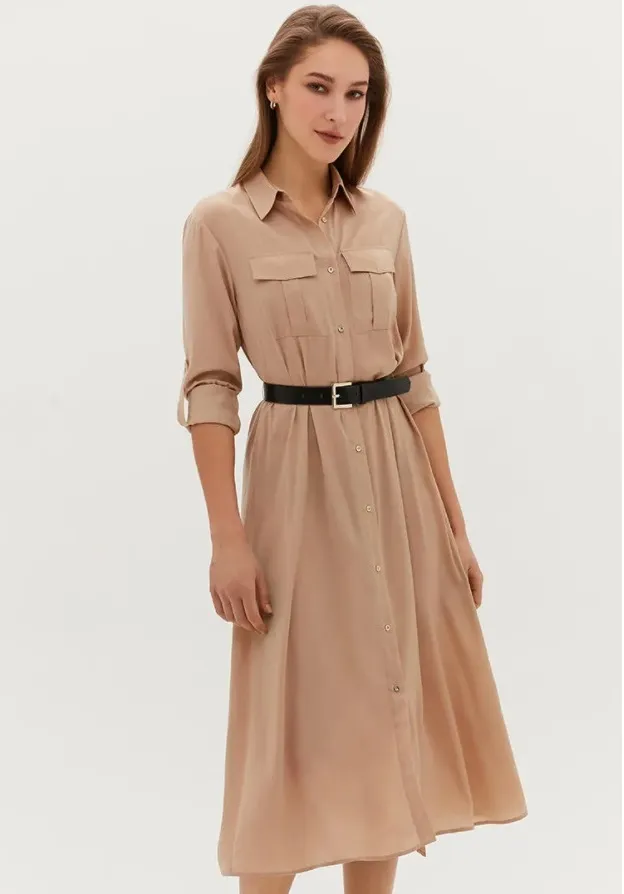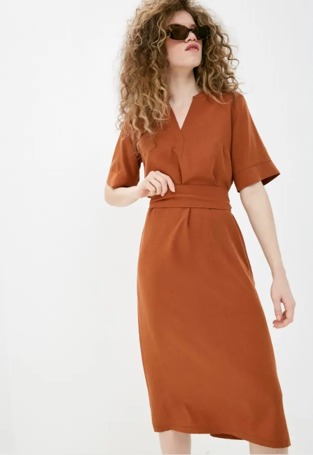 Вариант для поздней весны и лета — лаконичное платье простого кроя с поясом. Его можно по-разному стилизовать с помощью аксессуаров.