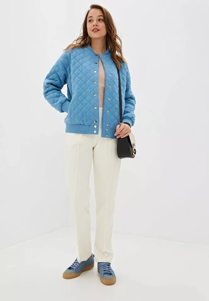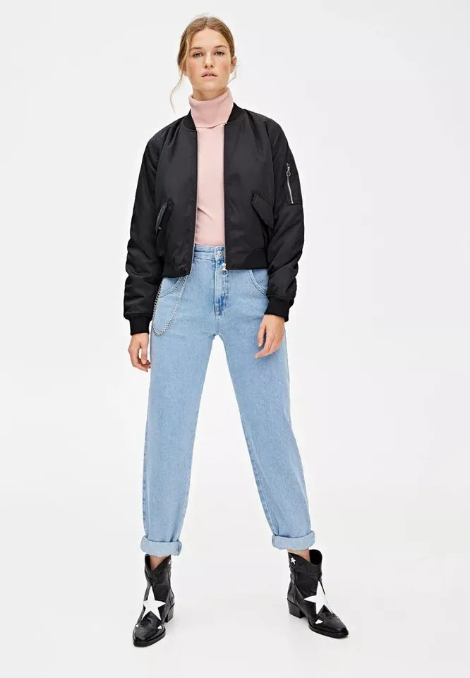1. Бомбер должен быть либо чуть ниже линии бедер, либо укороченный — до талии.