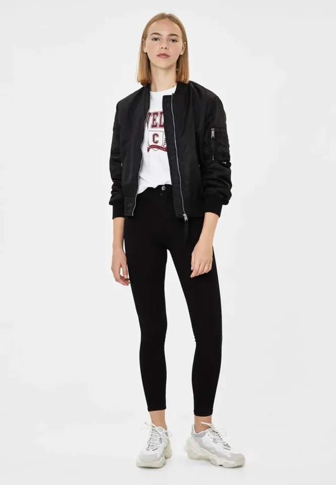 4. Распространенная ошибка — носить бомбер с футболкой или топом навыпуск. Это выглядит немодно и нарушает пропорции.