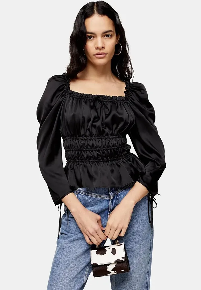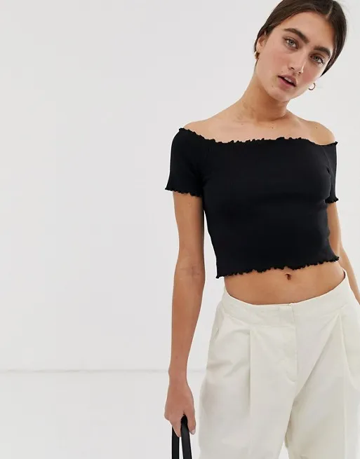 Такой топ поможет убить одним выстрелом сразу двух зайцев — открыть плечи и подчеркнуть длину шеи. При таком варианте лучше не увлекаться аксессуарами, иначе комбинация может показаться излишне навязчивой. Допускается лаконичное тонкое украшение на шею и маленькие серьги.