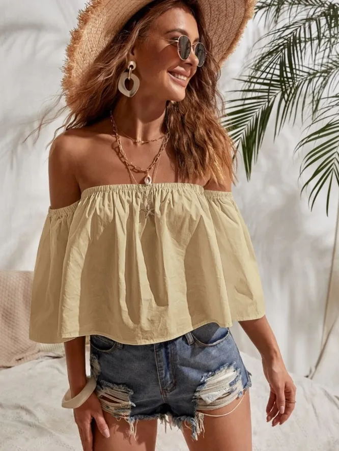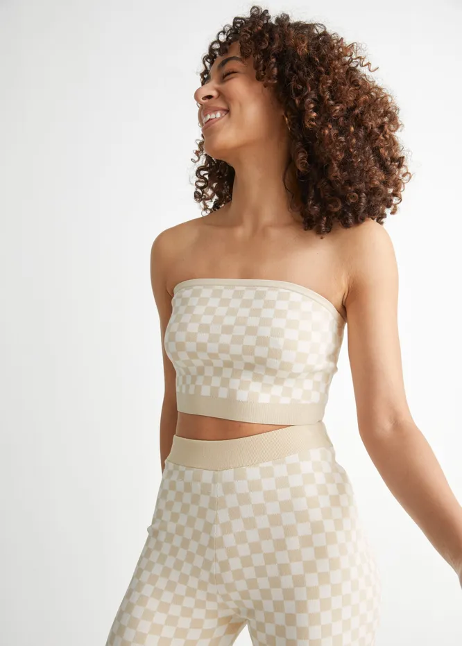 Если ищешь что-то простое, выбирай трикотажный топ-бандо. Дополняй его шортами или струящимися широкими брюками с высокой посадкой.